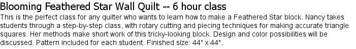 have fun in this information packed class. Pattern for each student includes instructions for making a wall quilt. Finished block size: 12" x 12".